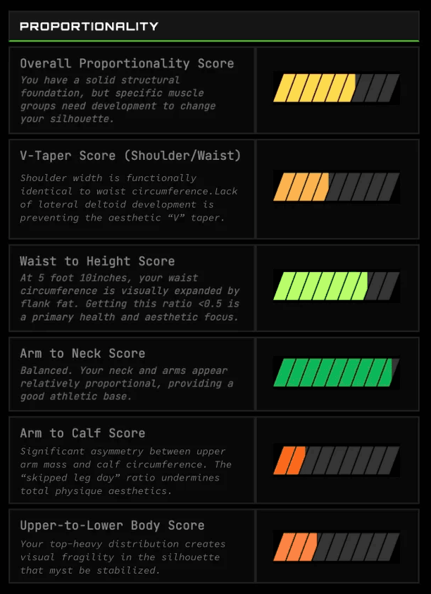 The engine ruthlessly highlights every asymmetry and weakness holding back your aesthetic. "Average" isn't an option.